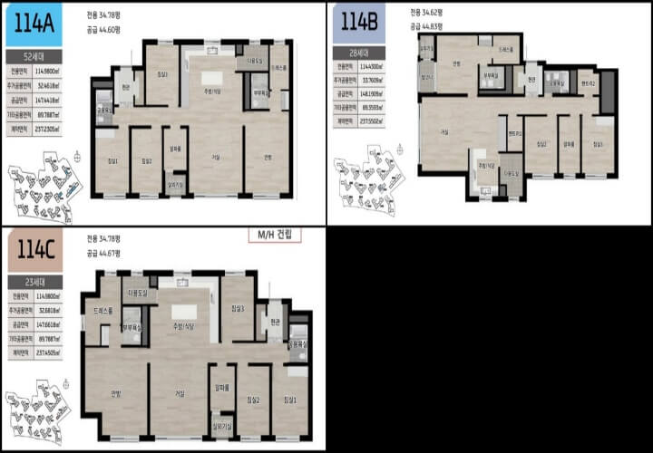 45평형 : 114A타입 (5.7억~6.1억원) / 114B타입 (5.6억~6.1억원) / 114C타입 (5.7~6.2억원)