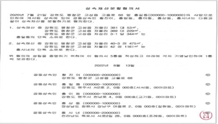 예를 들어, 갑은 강원도에 거주하고, 을은 서울, 병은 대구, 정은 경남, 무는 전남에 거주한다고 가정할 경우, 상속재산분할협의서 1통에 모두 인감을 날인하는 데 물리적으로 불편함이 따를 수 있습니다.